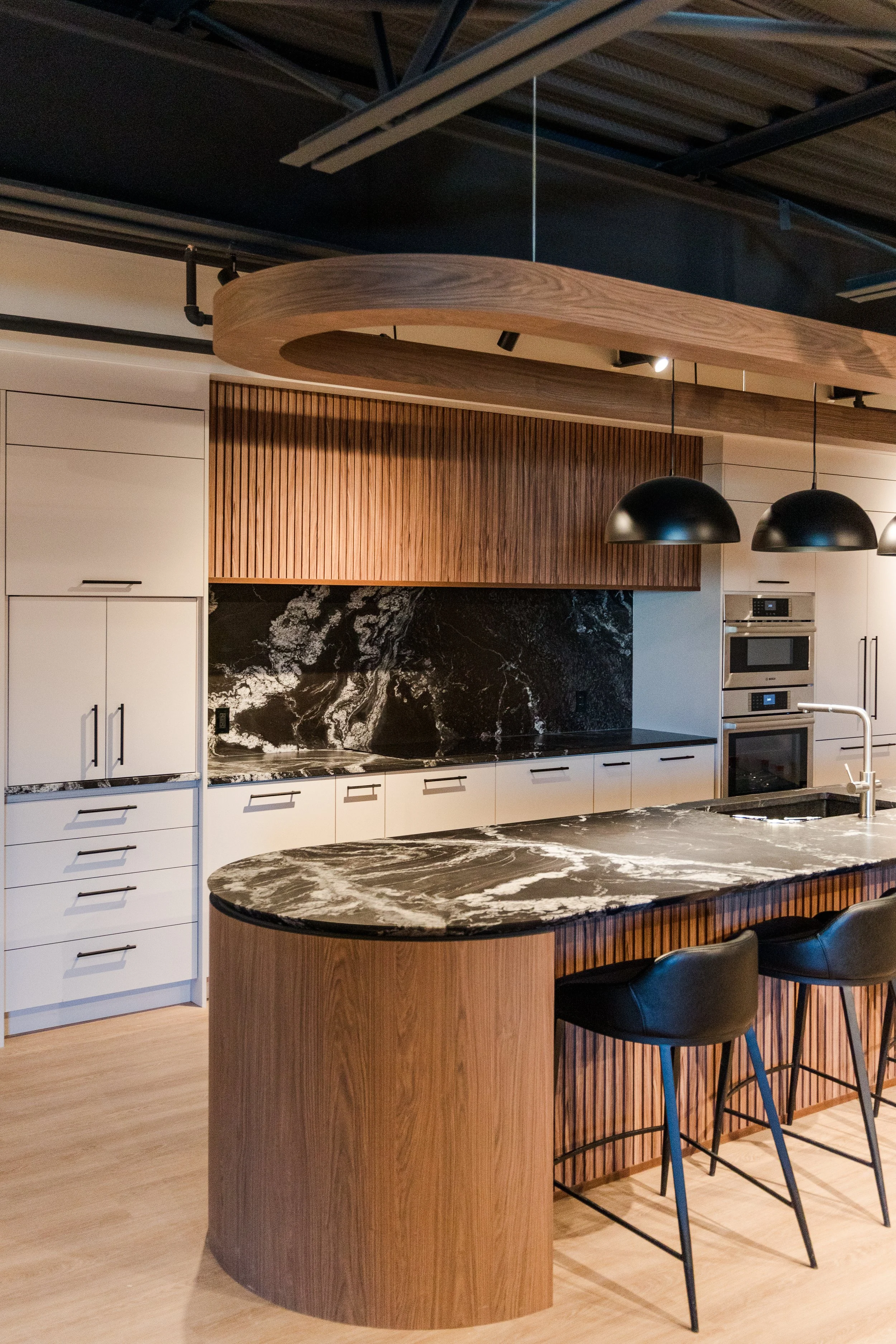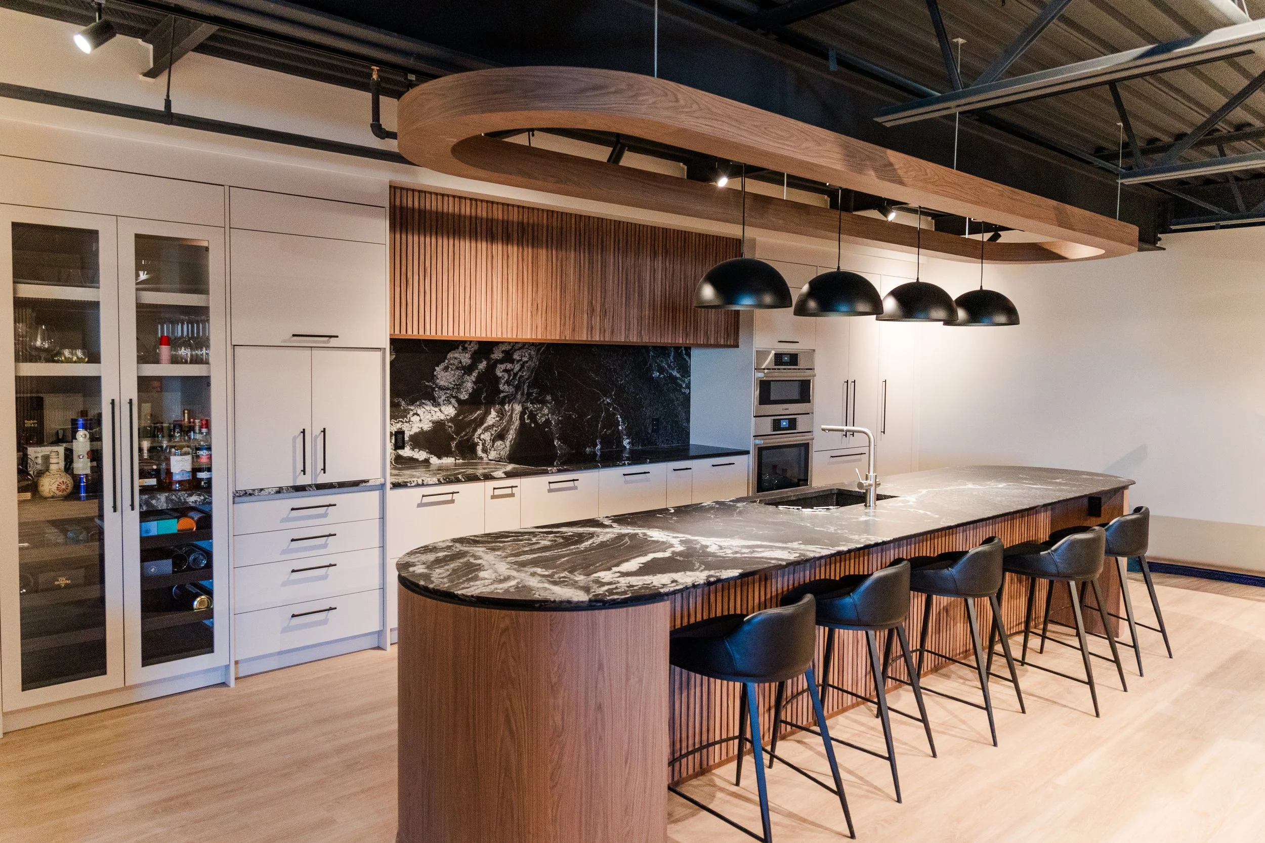 The finished commercial unit embodies Evergreen’s commitment to excellence in millwork design and fabrication. Every detail — from the feature wall to the integrated appliances — was crafted to create an environment that feels cohesive, functional, and distinctly modern.